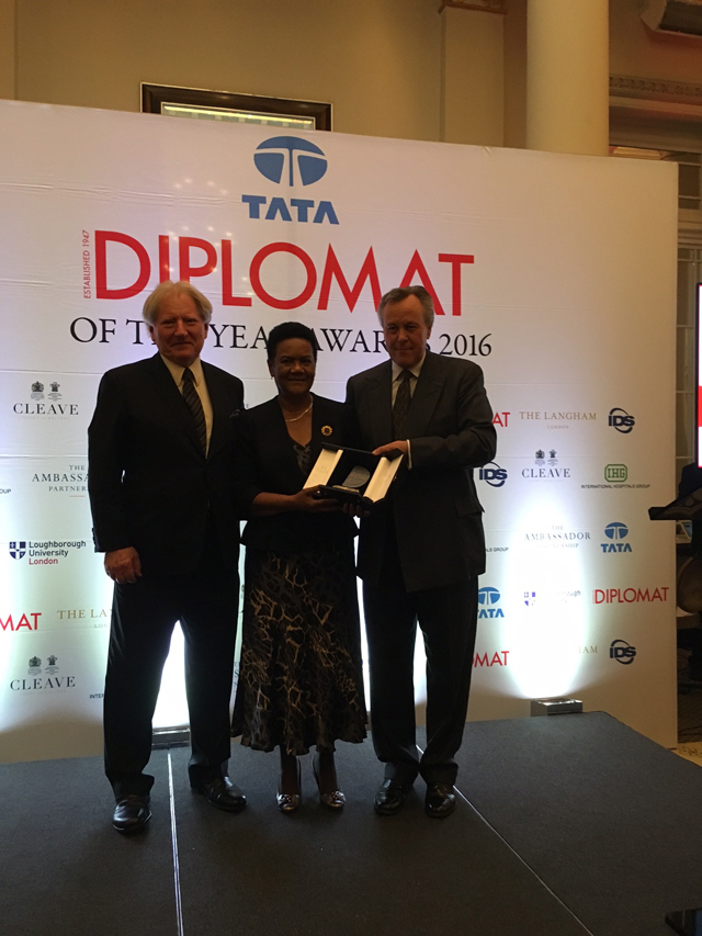 Marie-Pierre Lloyd received the award last week at the ceremony of the Tata DIPLOMAT magazine 2016 annual Awards in London. DIPLOMAT presented 10 awards to "some of the most influential diplomats based in the UK" during the ceremony.