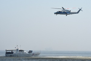 A helicopter from Japanese Coast Guard ship PLH02 Tsugaru hovers above a Philippine Coast Guard boat with its personnel as mock pirates during their annual anti-piracy exercise in the waters off Manila Bay on July 13, 2016, a day after a UN-backed tribunal declared China has no "historic rights" in the South China Sea. (TED ALJIBE / AFP)
