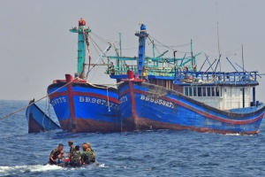 Indonesian navy personnel approach foreign fishing boats, seized for illegal fishing, before placing explosive used to sink the vessels at sea off Pontianak in West Kalimantan province, located in Borneo island, on August 18, 2015. The United States on Wednesday put a spotlight on global efforts to combat illegal fishing at the UN ocean conference, steering clear of the controversy over its pullout from the Paris climate deal. (AFP PHOTO / RUDI HARTONO)